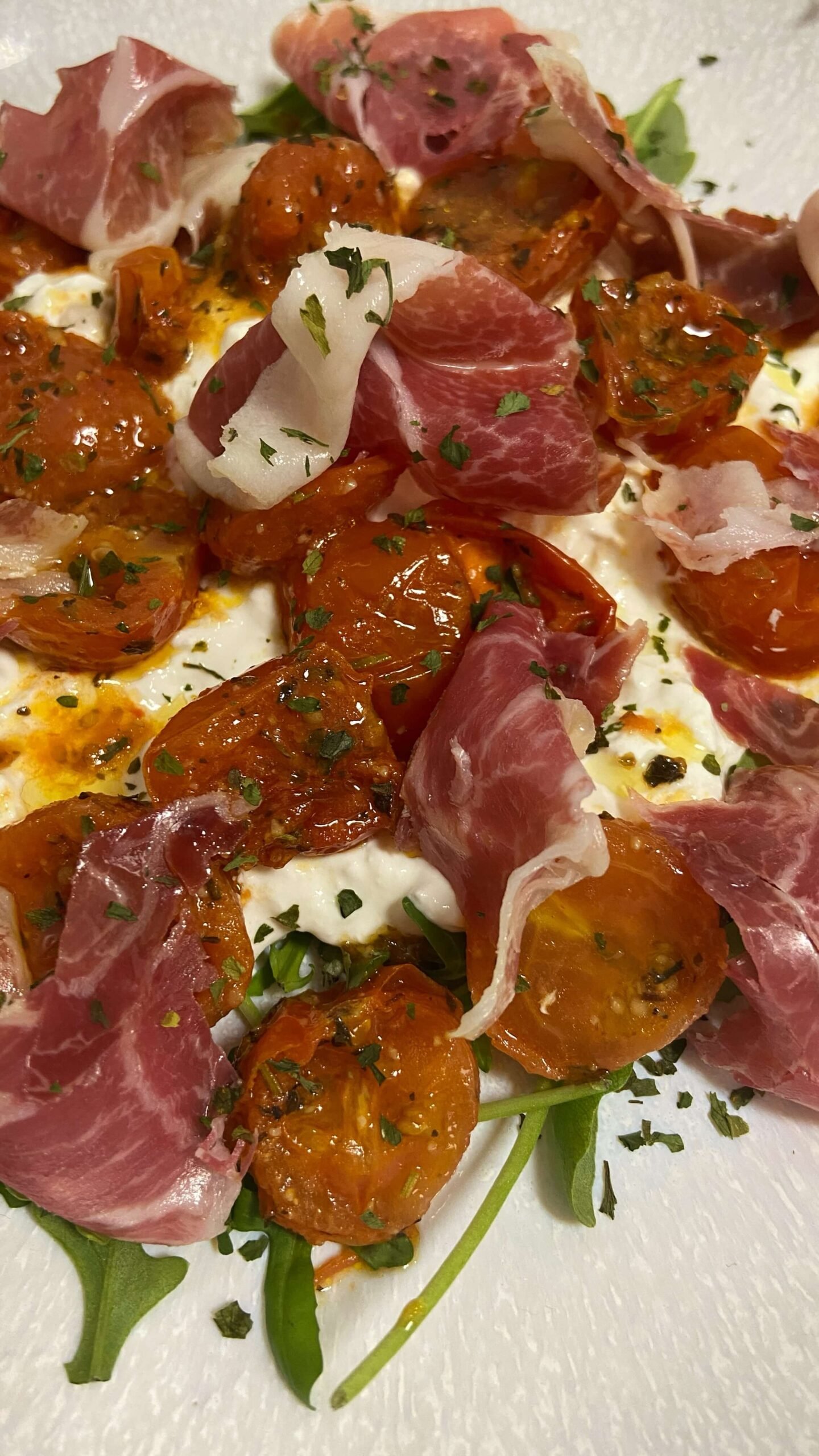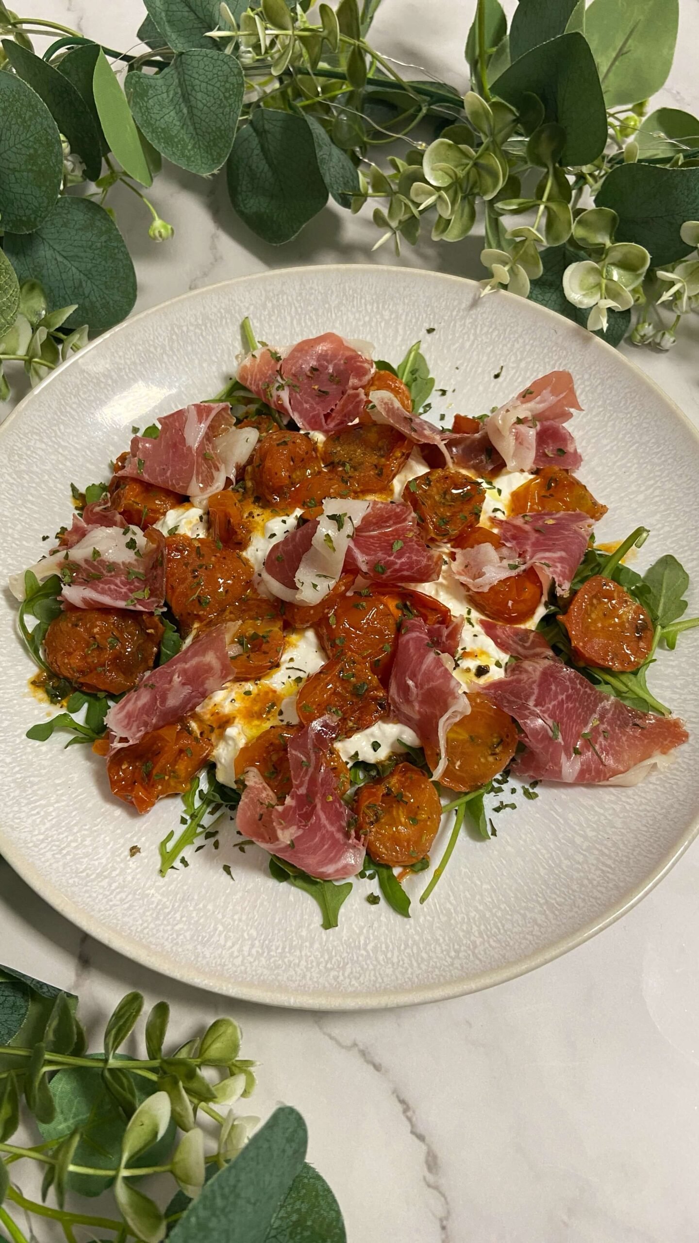 Deliciosa y fresca ensalada de burrata, jamón y tomatitos. Perfecta como entrante o plato ligero, esta receta en freidora de aire realza el sabor de sus ingredientes.