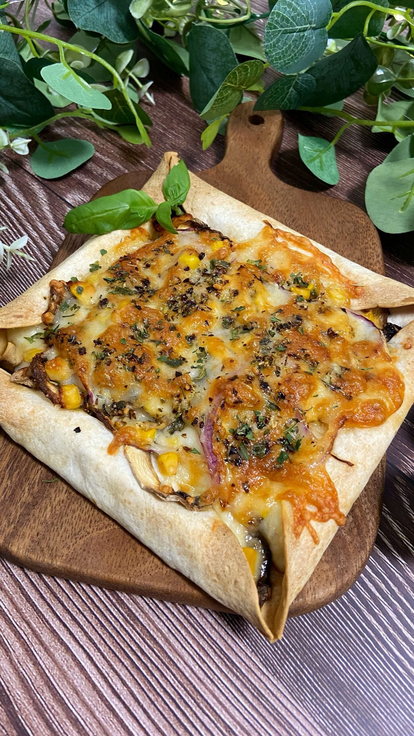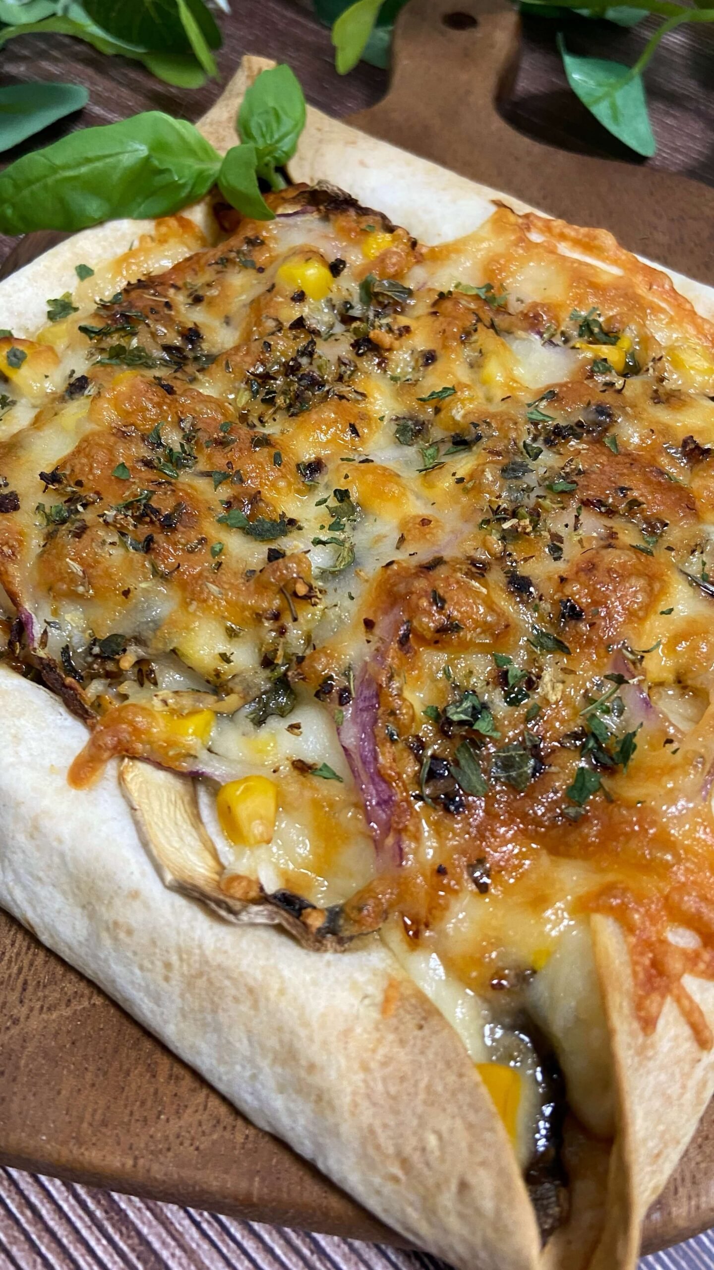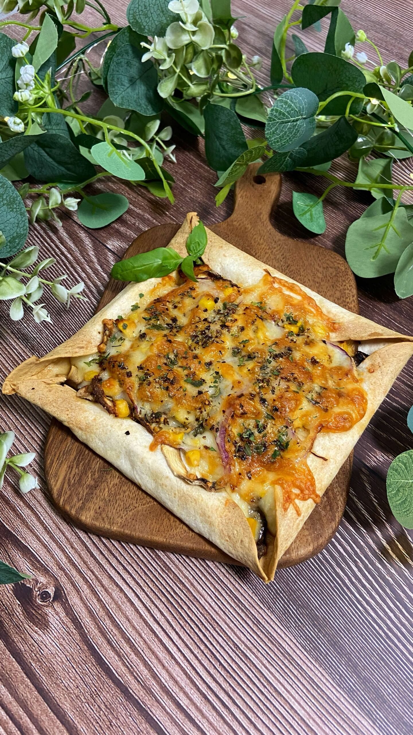 - 2Enrolla la tortilla sobre ellos formando un cuadrado.