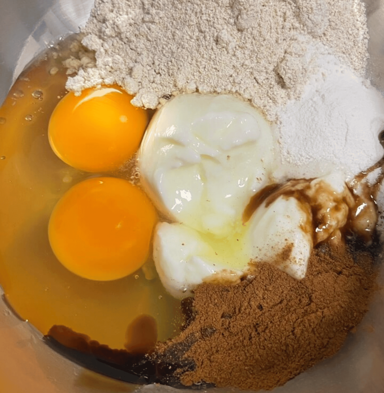 En un bol echamos los siguientes ingredientes: el yogur, los huevos, la harina, la levadura, la esencia de vainilla y la canela.