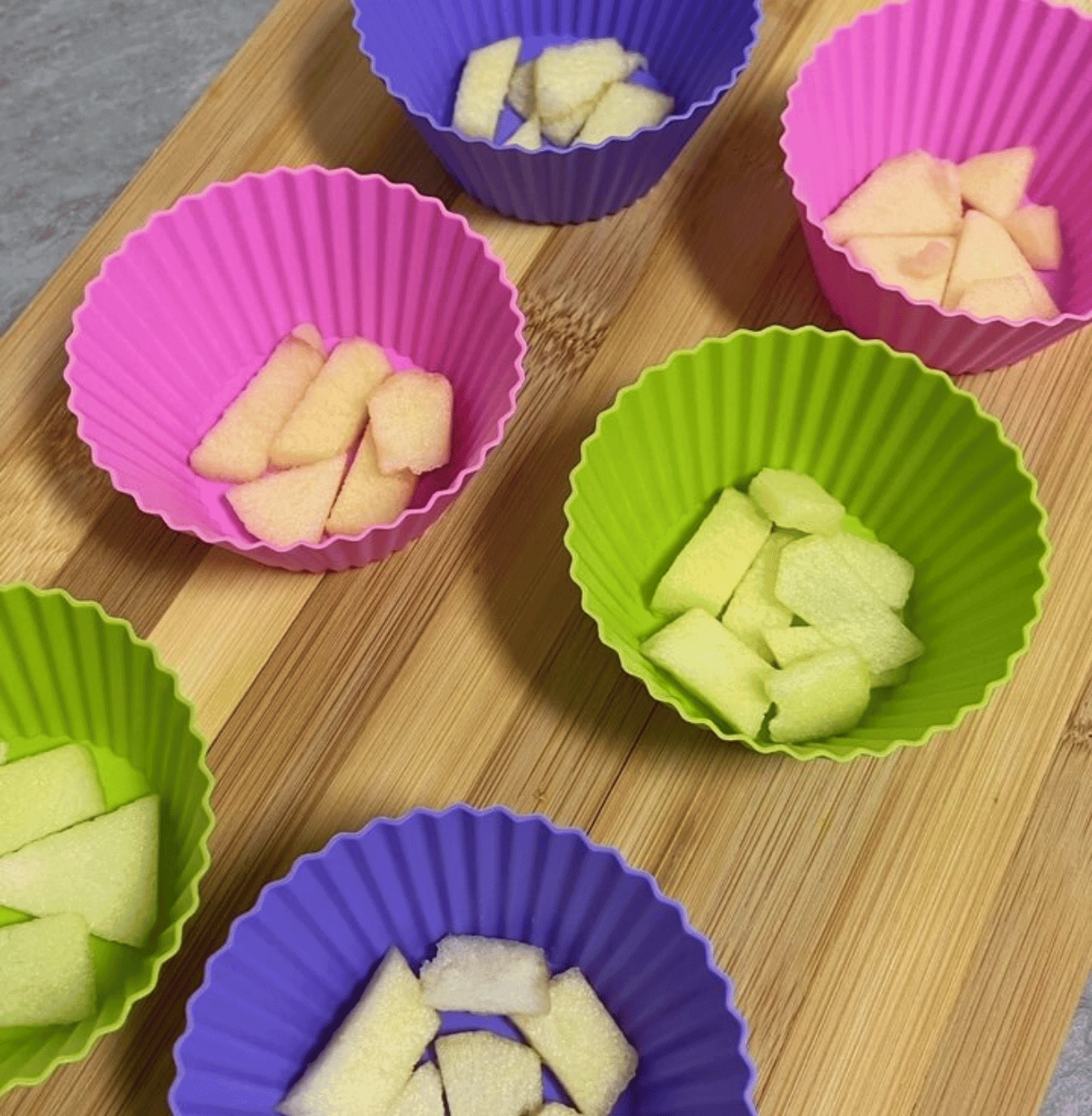 Echa la mezcla en los moldes y vuelve a cubrir con trozos de manzana.