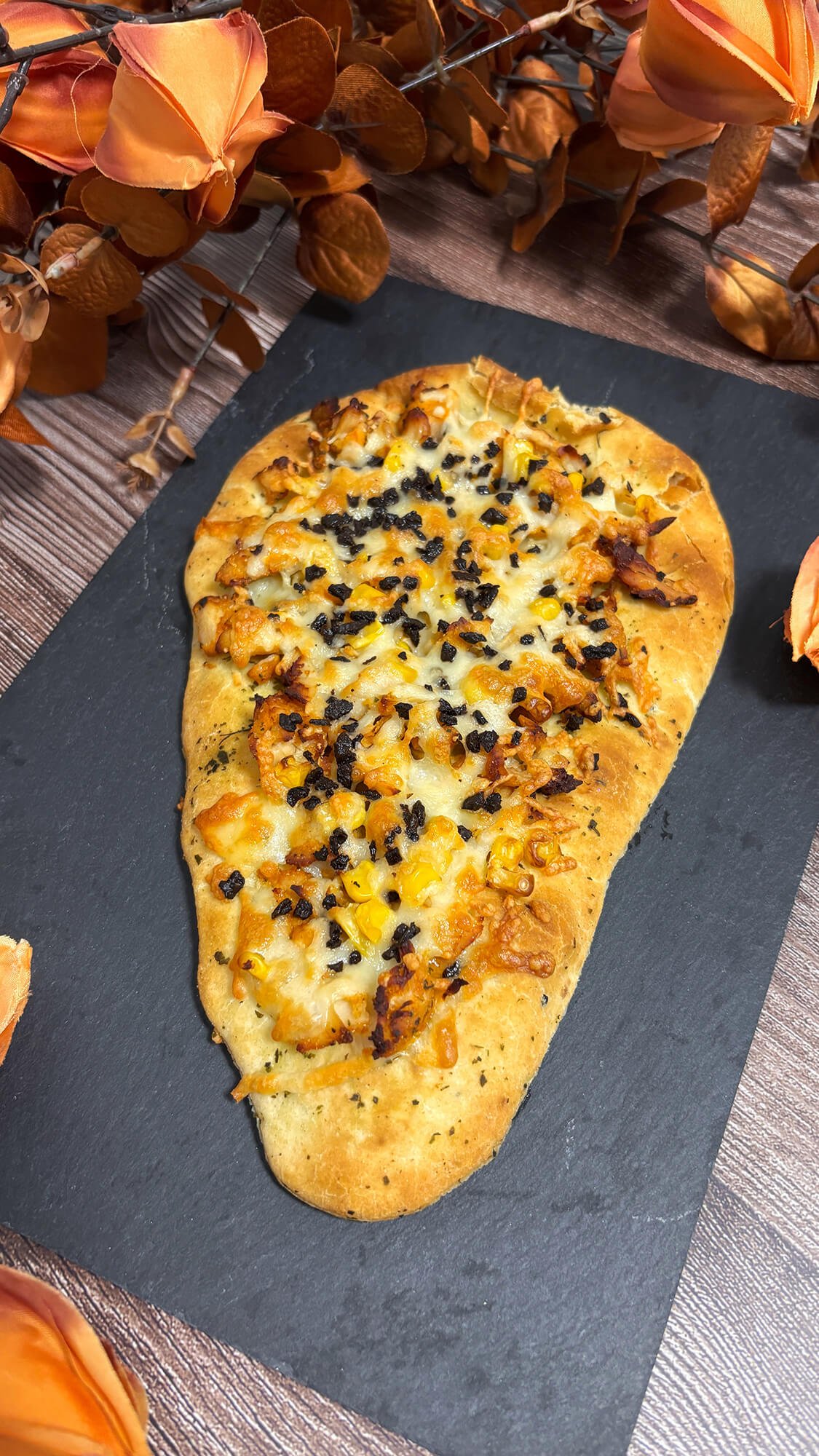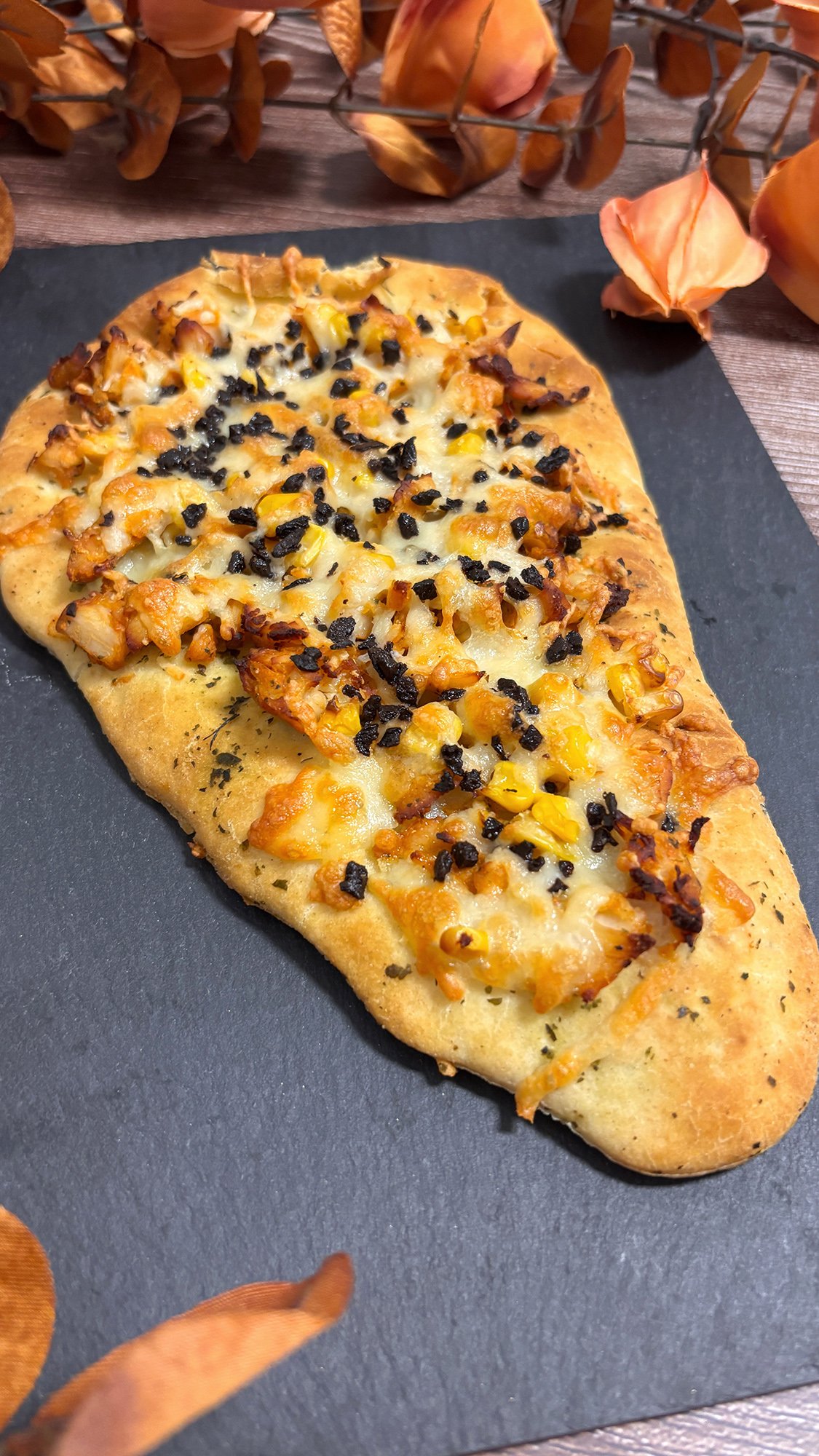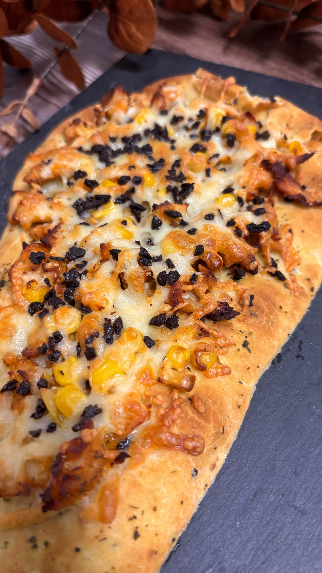 Ponemos sobre el pan la mozzarella, el pollo, maíz, la mozzarella y las aceitunas negras.