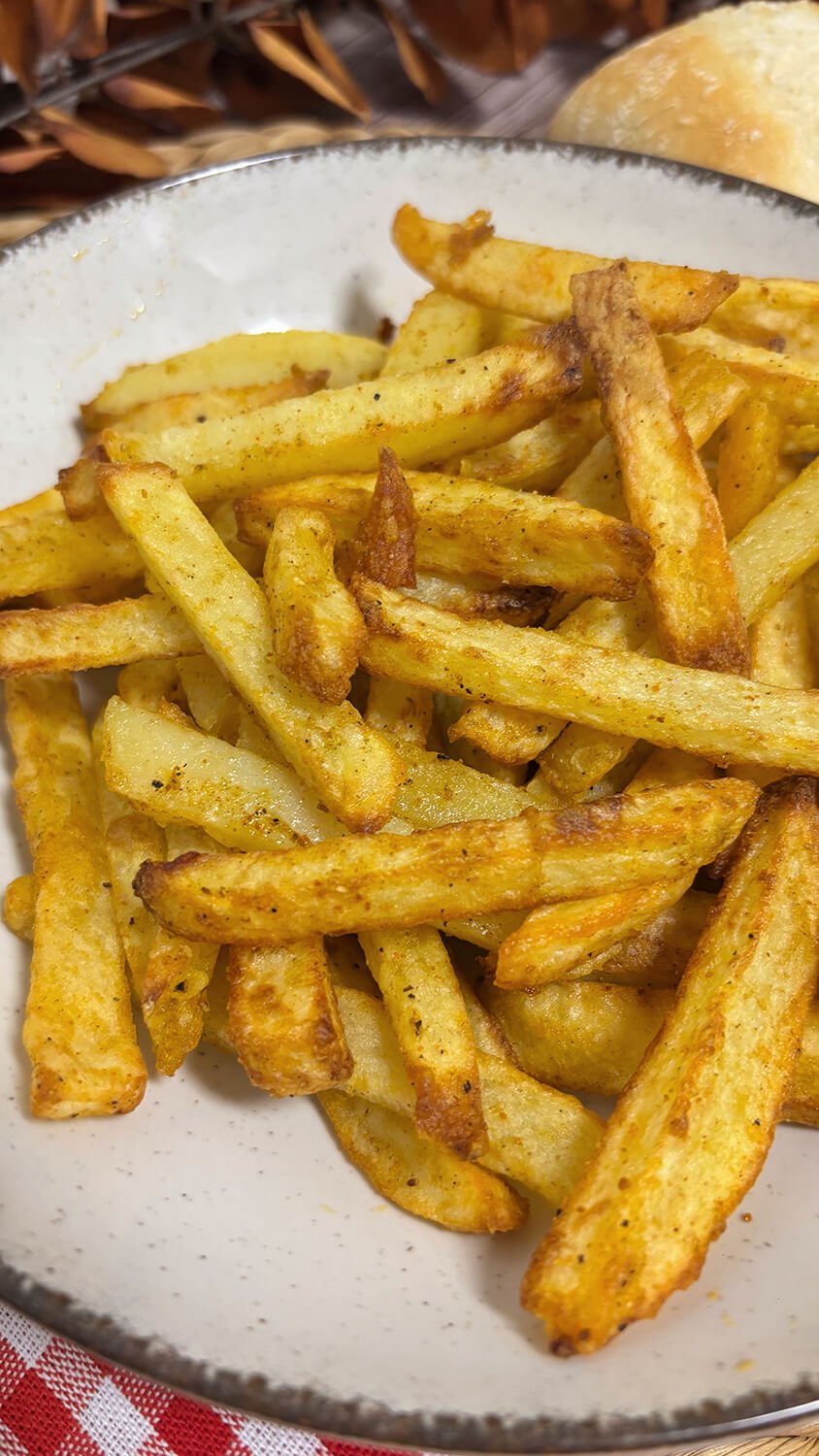 - 1Cortamos las patatas en bastones y sumergimos en agua muy fría durante 20 minutos para que suelten el almidón.