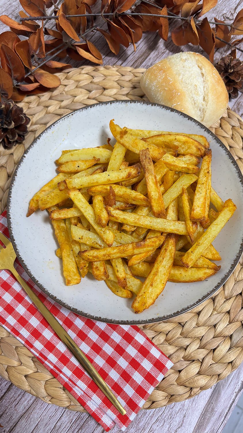 - 2Secamos muy bien las patatas y en un bol las pulverizamos con aceite. Echamos el almidón y mezclamos. Y a continuación el sazonador de patatas.
