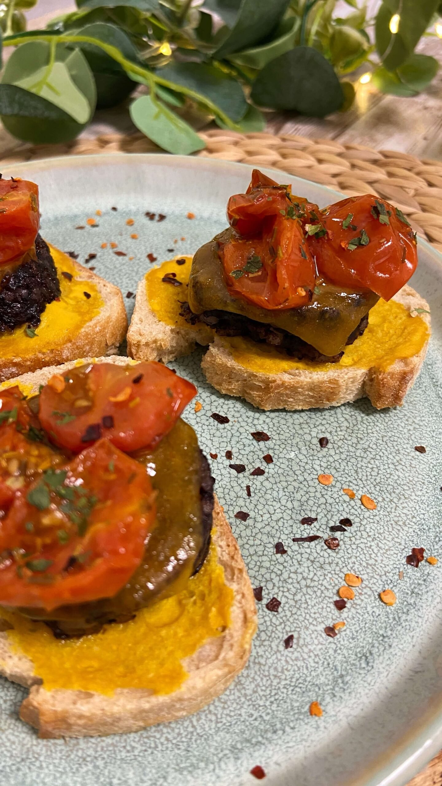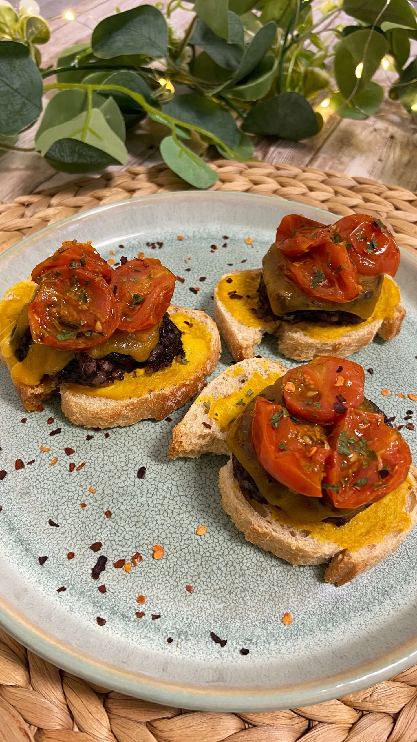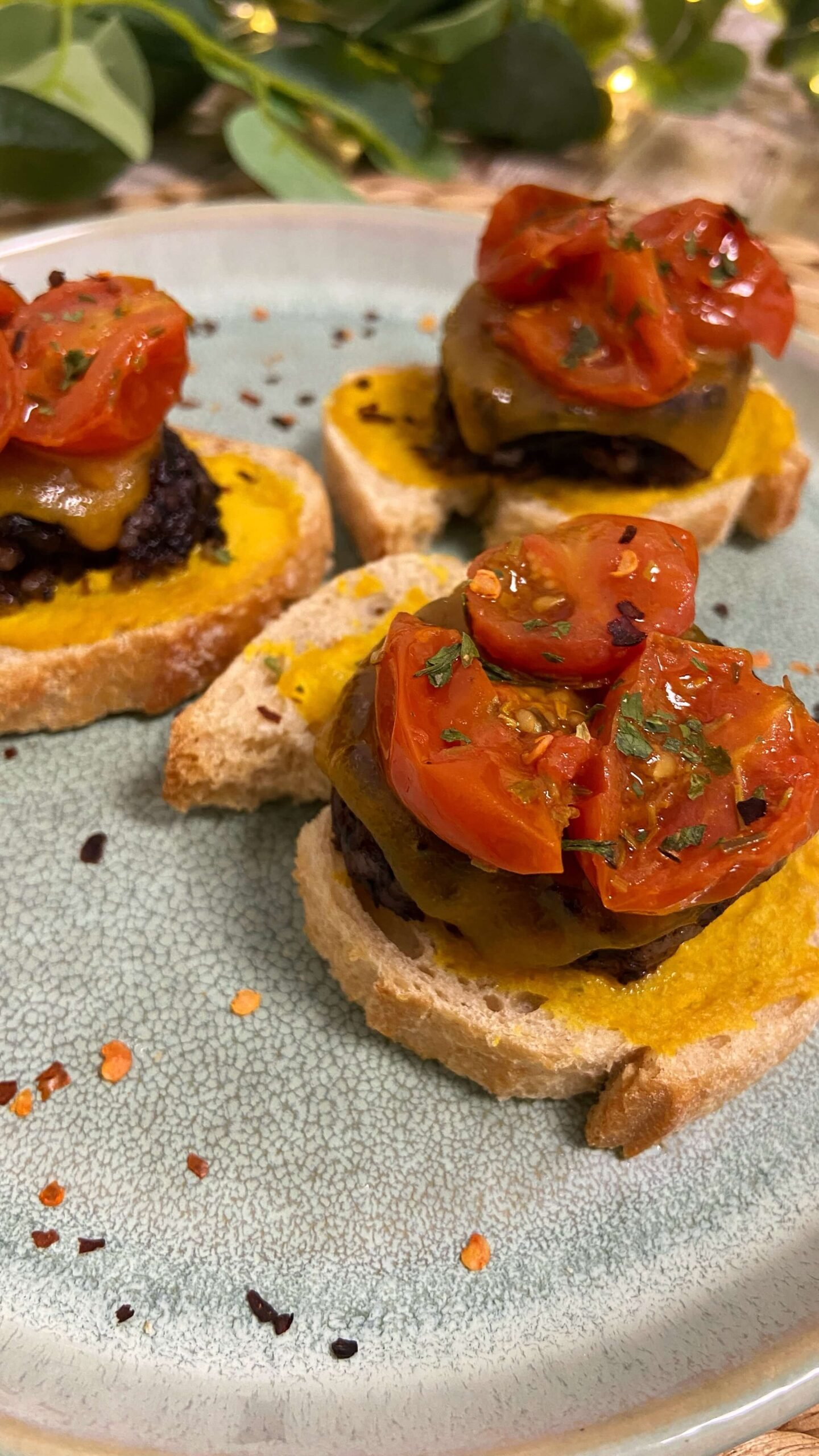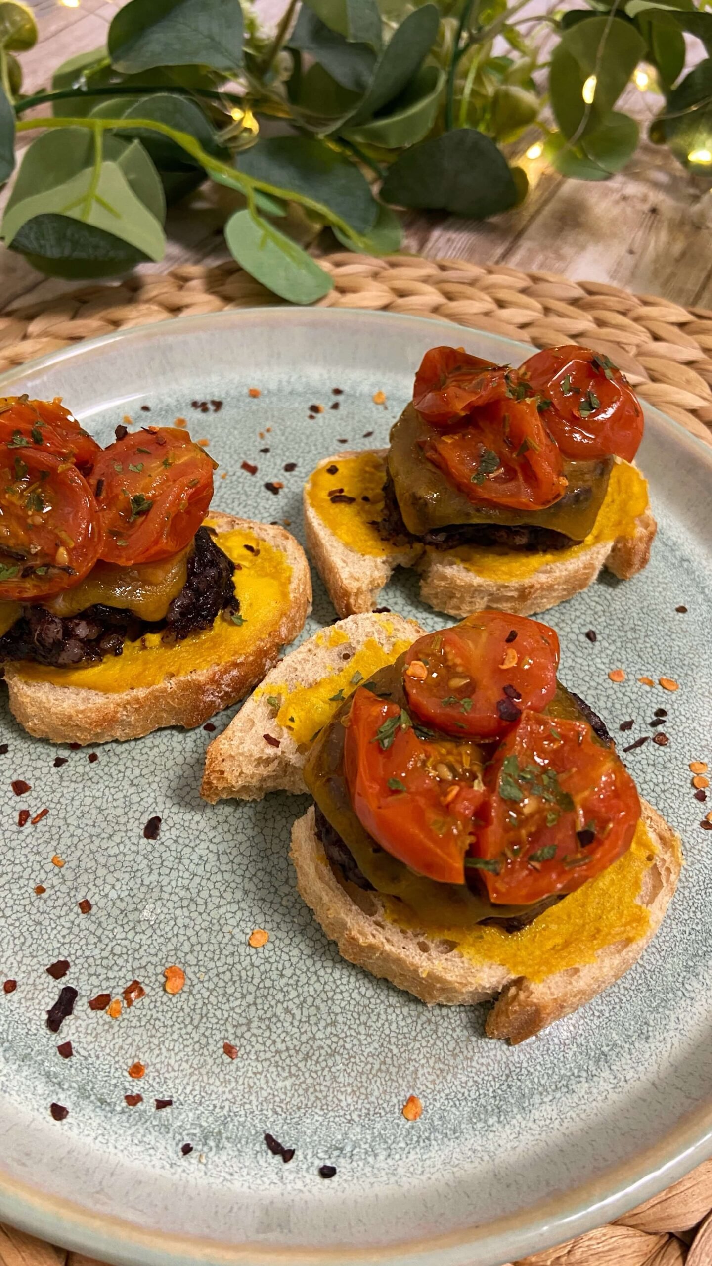 - 4Monta los pintxos en este orden: pan, mostaza, morcilla con el queso y tomatitos asados.